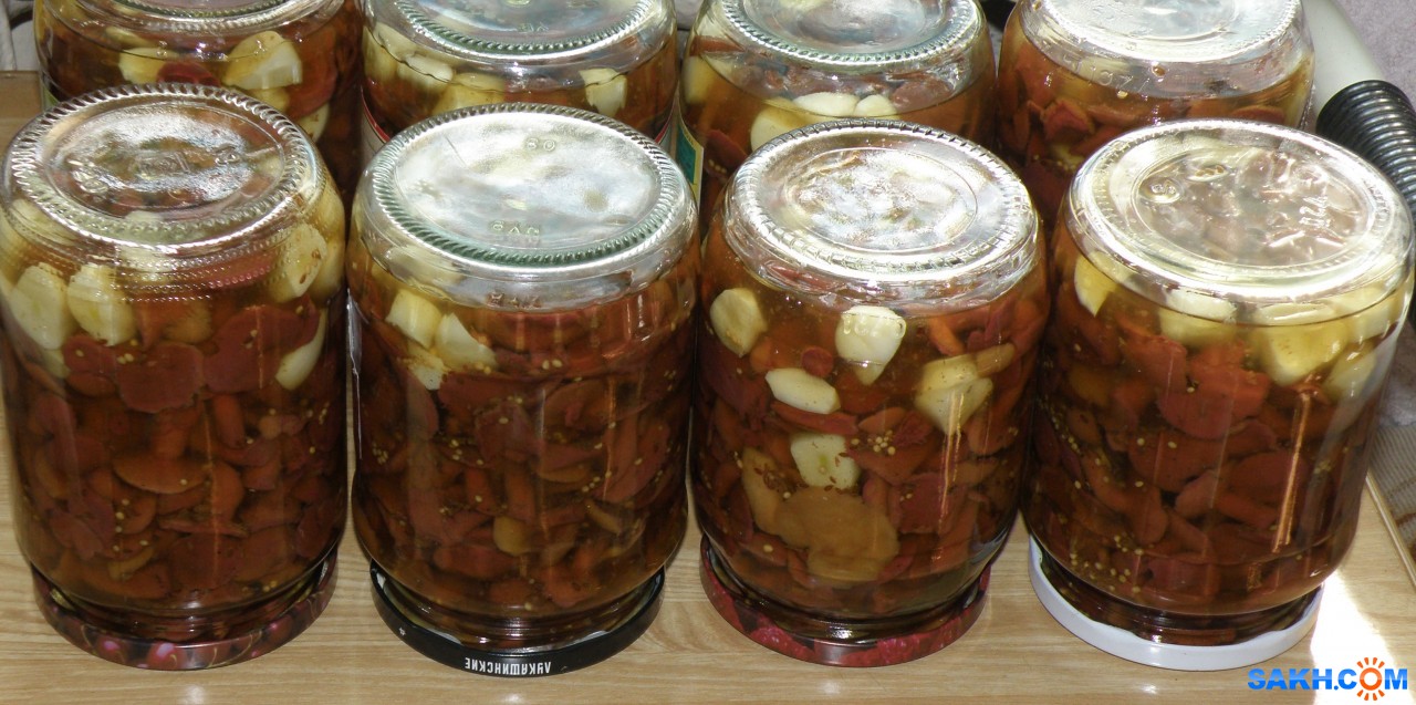 Маринад на 2кг грибов: на 1л воды, 2 стол ложки соли, 3 стол ложки сахара, 2 чайн. ложки уксусной кислоты 70%, семя укропа, перец горошек 8шт, чеснок 4шт. зубчика, лаврушка 3шт, семя горчицы.